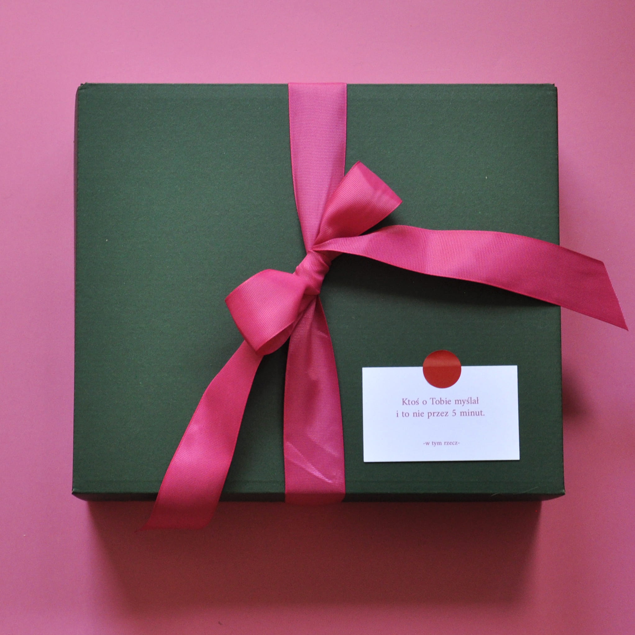 Całość została starannie zapakowana w ozdobne pudełko z kolorowym wypełnieniem i wykończona różowym papierem oraz spersonalizowaną kartką z dedykacją – możesz dodać własne życzenia lub podziękowanie, a my zadbamy o resztę.