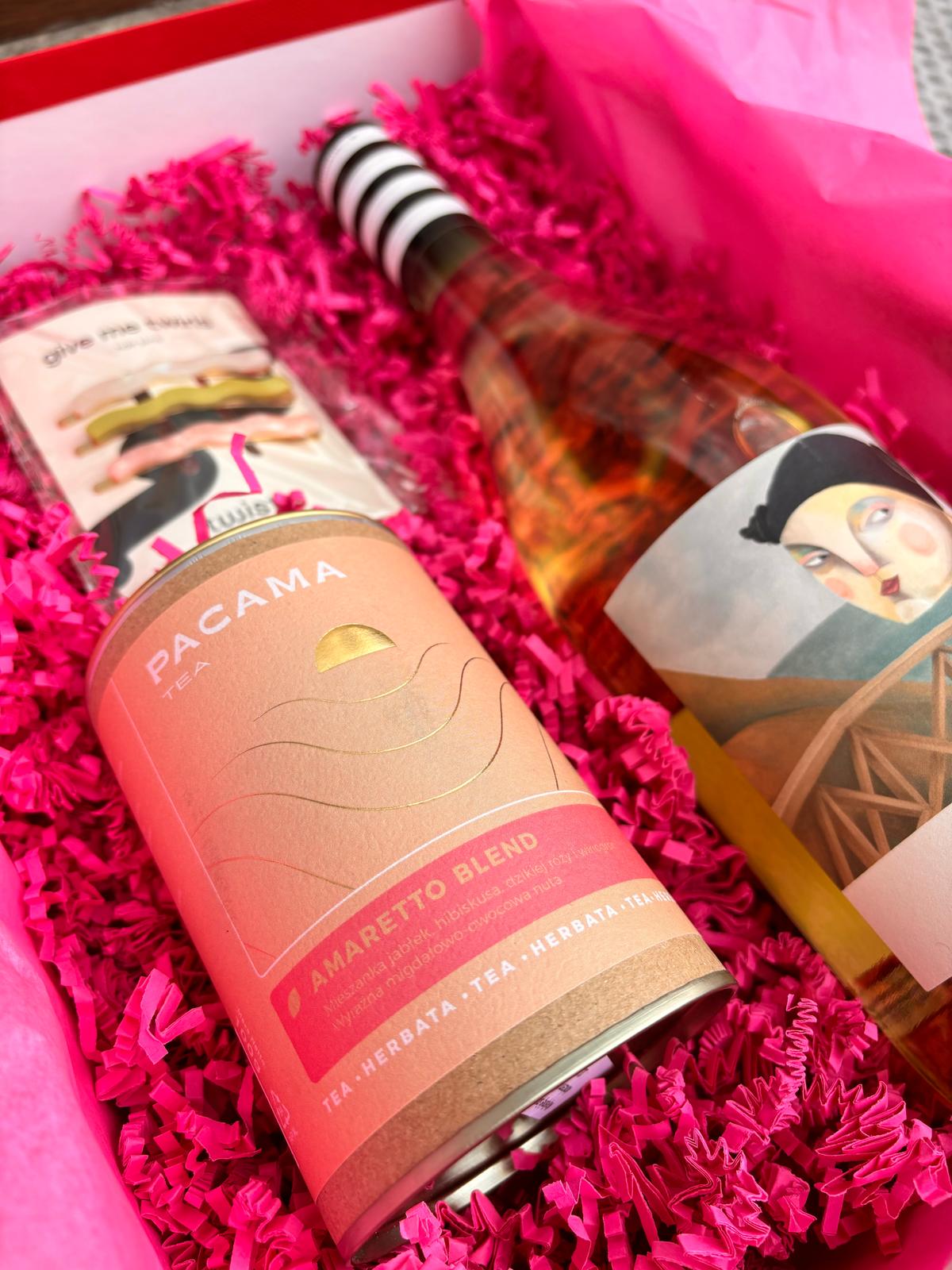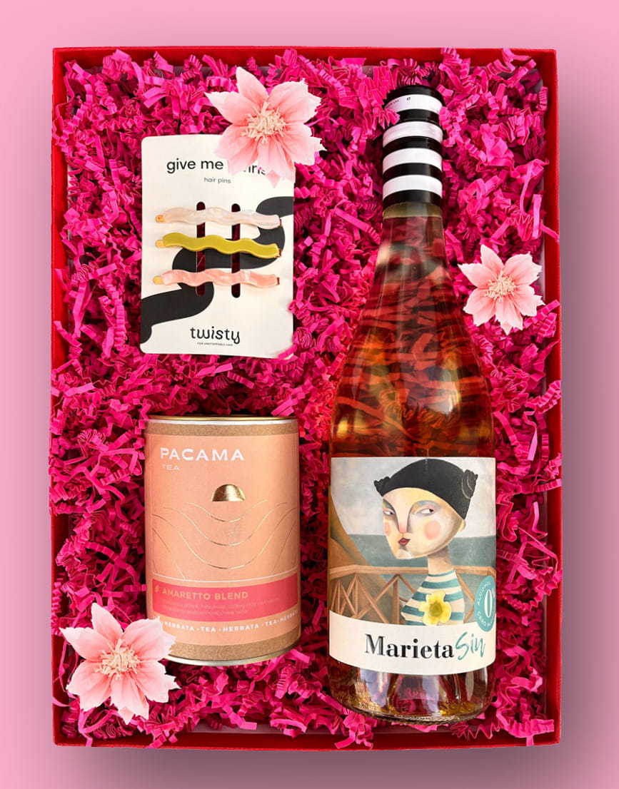 Różowy box prezentowy z winem bezalkoholowym Marieta, aromatyczną herbatą i uroczymi dodatkami- spinkami w 3 kolorach to świetny wybór na prezent dla niej – idealny na urodziny, Dzień Kobiet, baby shower, wieczór panieński czy podziękowanie.