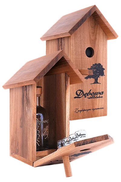To, co wyróżnia Dębową Wódkę, to jej unikalne opakowanie – butelka umieszczona w drewnianej budce dla ptaków, która dodaje jej wyjątkowego charakteru i czyni ją doskonałym prezentem na specjalne okazje. Ta elegancka prezentacja przyciąga wzrok i podkreśla luksusowy charakter wódki.