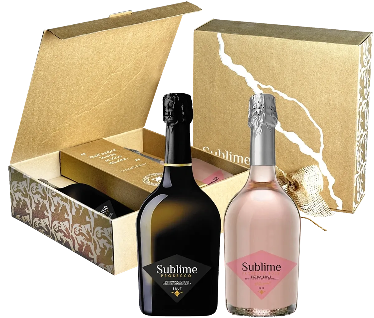 Zapakowany w prezentowe pudełko zestaw składający się z dwóch butelek wina prosecco - Sublime Brut i Sublime Rosé Extra Brut.